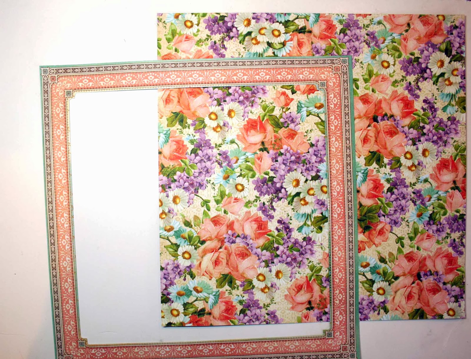 5. Now we have most of our parts assembled, lets put it all together now. Start by adherring the frame to the base paper, Perfect Petals 4500801. Then adhere the large circle on the left side overlaping the frame on the side.