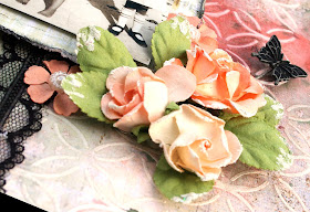The chipboard flourishes that I've used came in the main kit and I've embossed them with Ranger Antiquities embossing powder.  The flowers  I've used are from the flower add on.   The flower add on is always my favorite add on, but this month's is even better than usual and it is a moost have!!!  All the flowers are Prima and they are just divine!