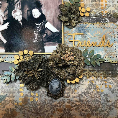 I've sprayed Petaloo Black Burlap Blossoms and sprayed them lightly with Prima Empress Gold mist. This softens the black color and adds a really pretty metallic gold cast to them.