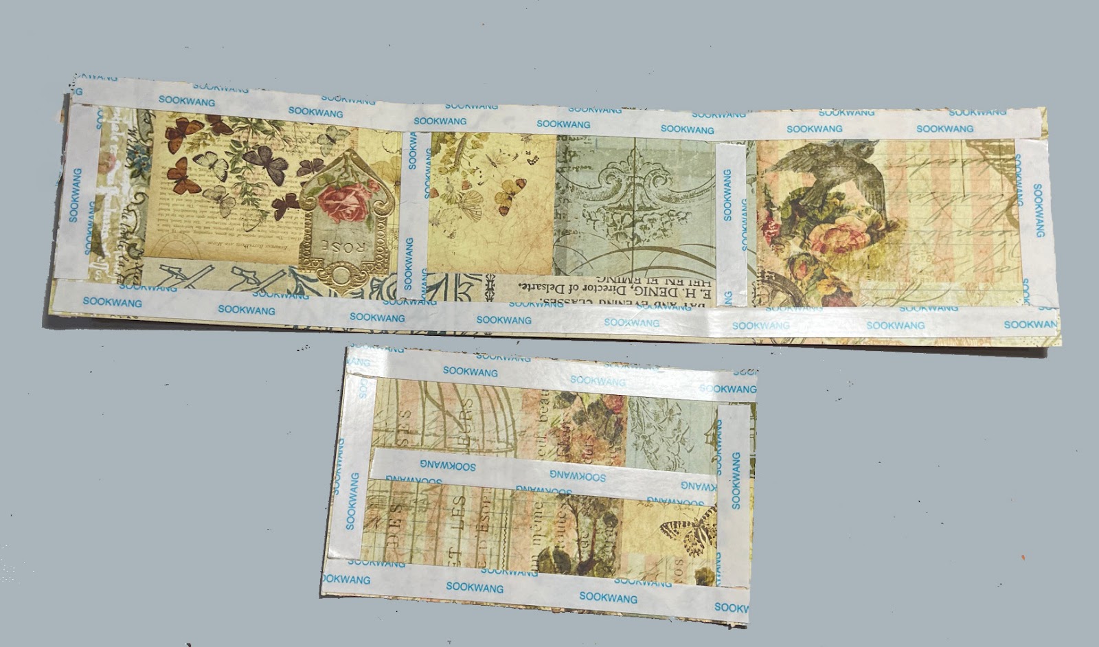 Step 1: Use 2 sheets of 6 x 13" matboard and run the die through your die cut machine twice. You should have the pieces shown in the photo below. You will also need 2 additional small strips shown at the bottom of this photo. Cover the flaps with red liner adhesive tape as shown in the photo. (You can use the adhesive of your choice. I like red liner tape because it has a strong bond.)