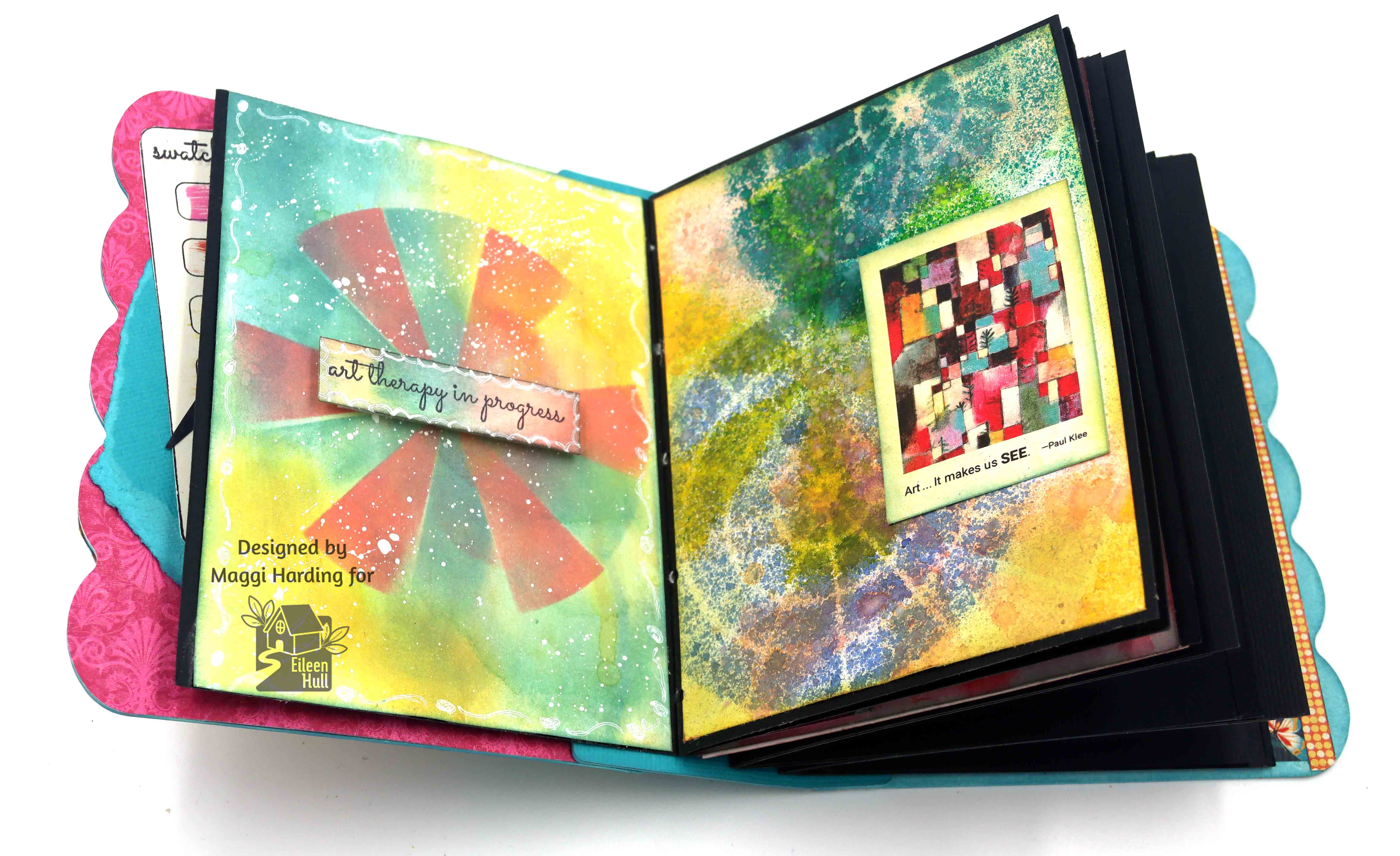 The left side page below is white cardstock embossed with Eileen's Floral Damask embossing folder. Then I sprinkled on Ken Oliver's Color Burst powders in several colors, spritzed with water, and this is the result. I love it! I did the same thing on the right side except that I did not emboss the paper. Instead, I used stamps from Eileen's Swatch Card set to label the colors I used.